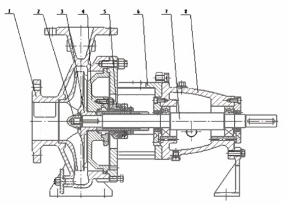 采用後拉(la)式結構,帶中間節(jiē)膜片聯軸器,維修(xiū)時不用拆卸泵體(ti),電機,管線;